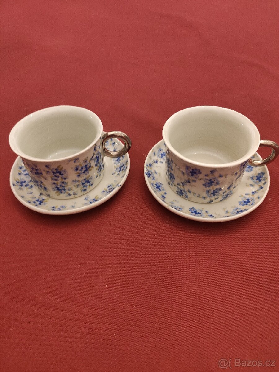 Souprava dvou keramických hrnečků na kávu. Ruční výroba. Motiv pomněnek, stříbrná ouška. Vyrobeno 1997, monogram autora MR.