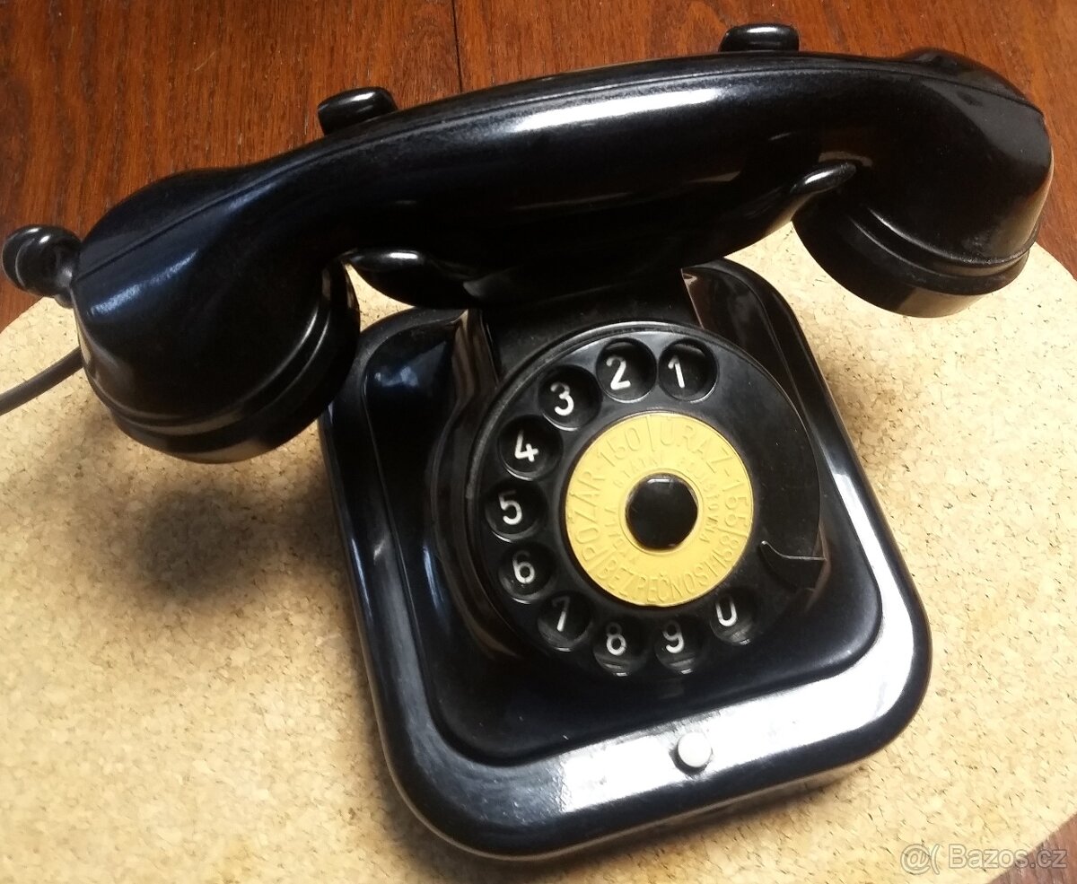Starý vidlicový bakelitový telefon s otočnou číselnicí, s čísly na záchranné složky - požár či úraz a policii. Tlačítko na spojovatelku. Okénko na Vaše telefonní číslo. Jerště klasický kovový kladívkový zvonek, Černý, při posledním použití funkční. Stáří zhruba 70 let.