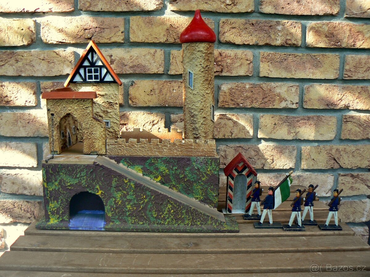 stará dřevěná tvrz s vojáky- První republika-velice pěkné provedení-vojáci výška 8 cm, celkový rozměr 37x23x 42 cm výška věže-pěkný stav viz foto