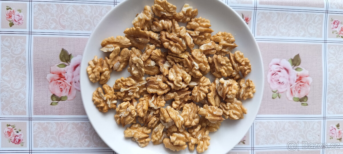 Prodám loupané vlašské ořechy směs půlek a zlomků. 1 ks/250 Kč. Vlašské ořechy jsou výbornou potravou pro lidi s nemocným srdcem, a to zejména ze tří důvodů: 1. Kvůli vysokému obsahu mastných kyselin. 2. Pro obsah vitaminu B1, který podporuje svalové funkce, včetně funkcí srdečního svalu. 3. Snižují hladinu cholesterolu v krvi. Vlašské ořechy by se měly stát součástí jídelníčku lidí, kteří trpí srdečním selháním z jakékoliv příčiny, anginou pectoris nebo u nichž je vysoké riziko infarktu myokardu, rekonvalescentům po infarktu myokardu. Při pravidelné konzumaci ořechů se sníží hladina LDL cholesterolu (tzv. špatného cholesterolu) Ořechy jsou bohaté na esenciální mastné kyseliny, které se podílejí na metabolismu v neuronech. Dále obsahují lecitin, fosfor a vitamin B6 - zlepšují duševní výkonnost. Vlašské ořechy by neměly chybět ve stravě studentů, duševně pracujících a sportovců.