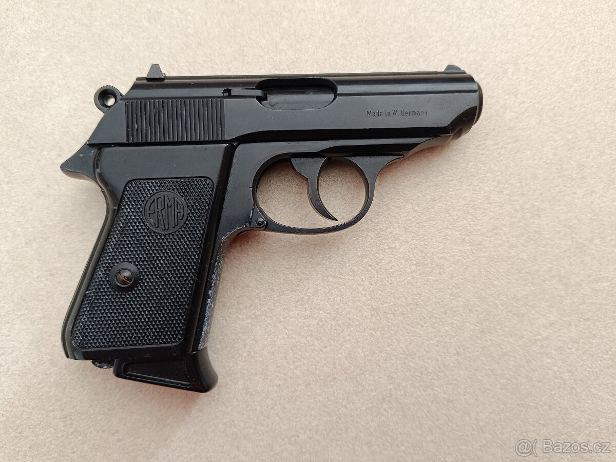 Pistole ERMA-WERKE Mod. ERP 74 cal. 4mm flobert. Přesná kopie Walther PPK vyrobena v 70 letech v Německu, perfektní mechanika, plně funkční. Pistole sama přebíjí po výstřelu vždy při zmáčknutí spouště. Flobert náboje se vkládají do adaptérů. Součástí nabídky 6ks adaptérů, krabička nábojů. Zbraň kategorie NO (staré D) bez nutnosti ohlášení.