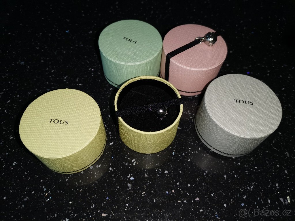 Prodám novou dárkovou krabičku s gumičkou na,které je rolnička je určena na šperky s logem TOUS v případě by šlo přelepit. 4 barvy viz. foto. Minimální odběr 10ks.Cena za kus.