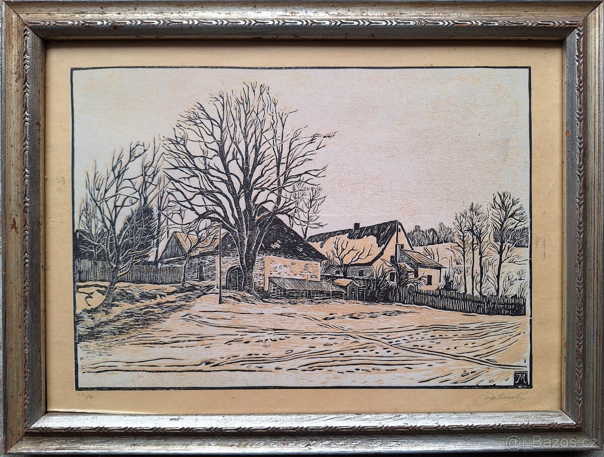 Jelínkův mlýn, Nové Město na Moravě, litografie, celkový rozměr s rámem 26x35 cm, signováno.
