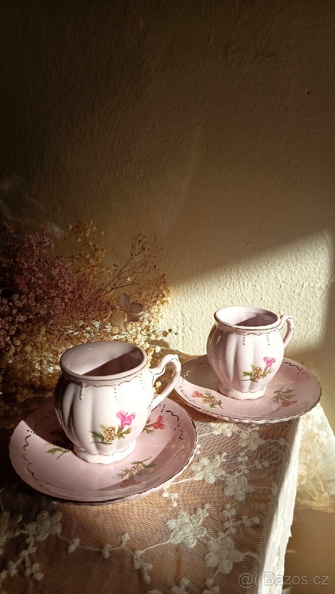 Malé růžové porcelánové šálky o objemu 100 ml, ideální pro vaše ranní espresso. I bez značení působí autenticky vintage, s jemnou ruční malbou a něžným designem, který okouzlí každého milovníka porcelánu.