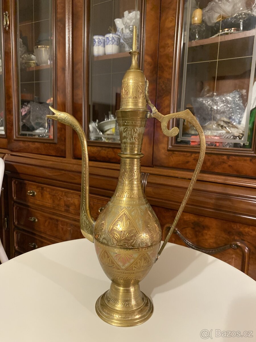 Starožitná mosazná VYSOKÁ karafa tepaná, barevná, Indie