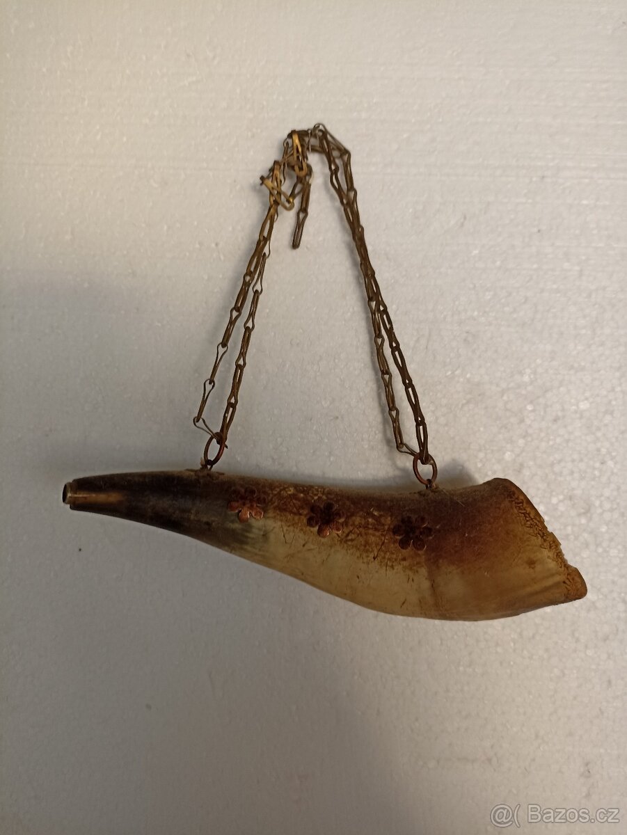 Zvířecí roh s řetízkem na pověšení. Mosazné ozdoby - hvězdičky.