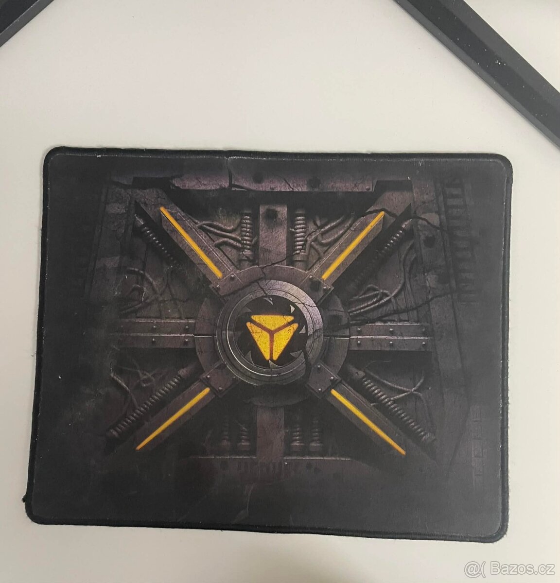 Nabízím stylovou podložku pod myš s propracovaným industriálním designem. Podložka má motiv mechanického jádra s výrazným žlutým symbolem uprostřed. Je ideální pro hráče nebo kohokoliv, kdo chce oživit svůj pracovní stůl něčím unikátním.