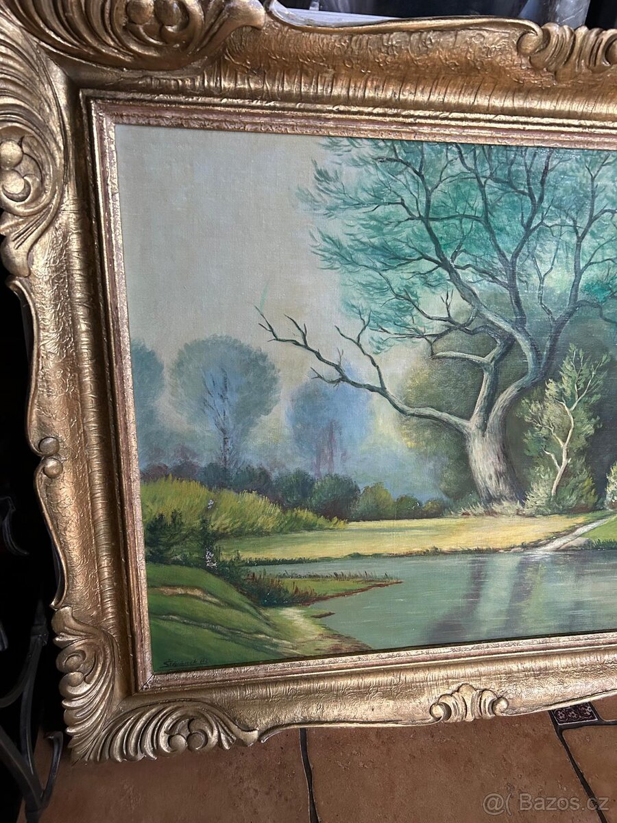 Malba na kartonu starý dřevěný rám 77x97 cm malba 78x58 cm stav foto