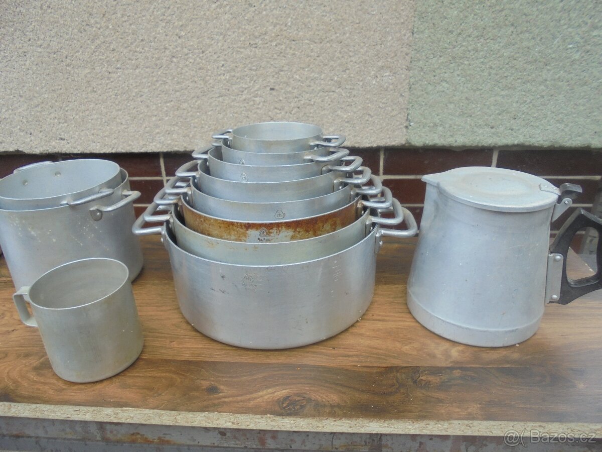 prodám staré hliníkové nádobí, viz foto, prodám jako celek, kastrůlky mají objem od 1/3l do 3,5l a hrnce 1,5 a 2l