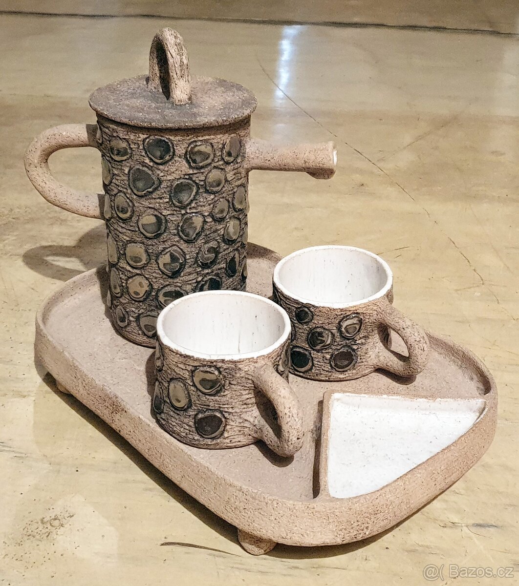 Prodám výstřední kávový keramický set (konvička s poklicí, dva šálky a podnos). Jedná se o ruční práci mé sestřenice, tedy o absolutní originál! Vhodný darek!!