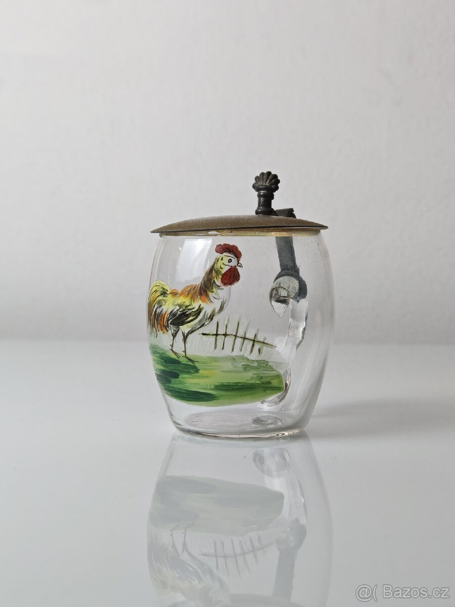 Nabízím krásný starožitný malý skleněný korbel s cínovým víčkem s malovaným kohoutem. Krásná funkční dekorace třeba na Velikonoce. Výška cca 7,5 cm. Pěkný stav, malinký mikrooťuk, viz. foto.