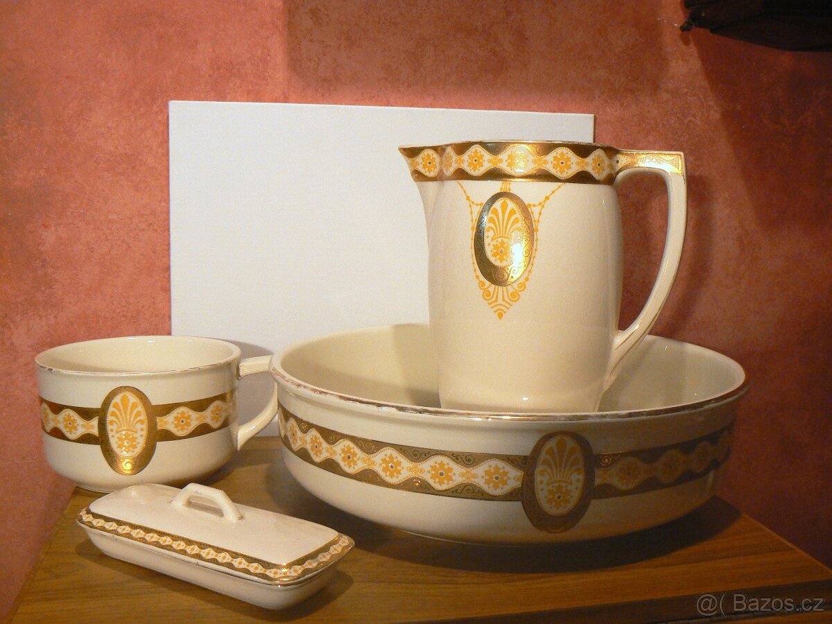 starý džbán-lavor- nočník-keramická mycí sada- slonová kost-odstín-jedinečný plastický -zlatý ornament - nádherné provedení, velice pěkný- původní stav-viz foto-bez poškození