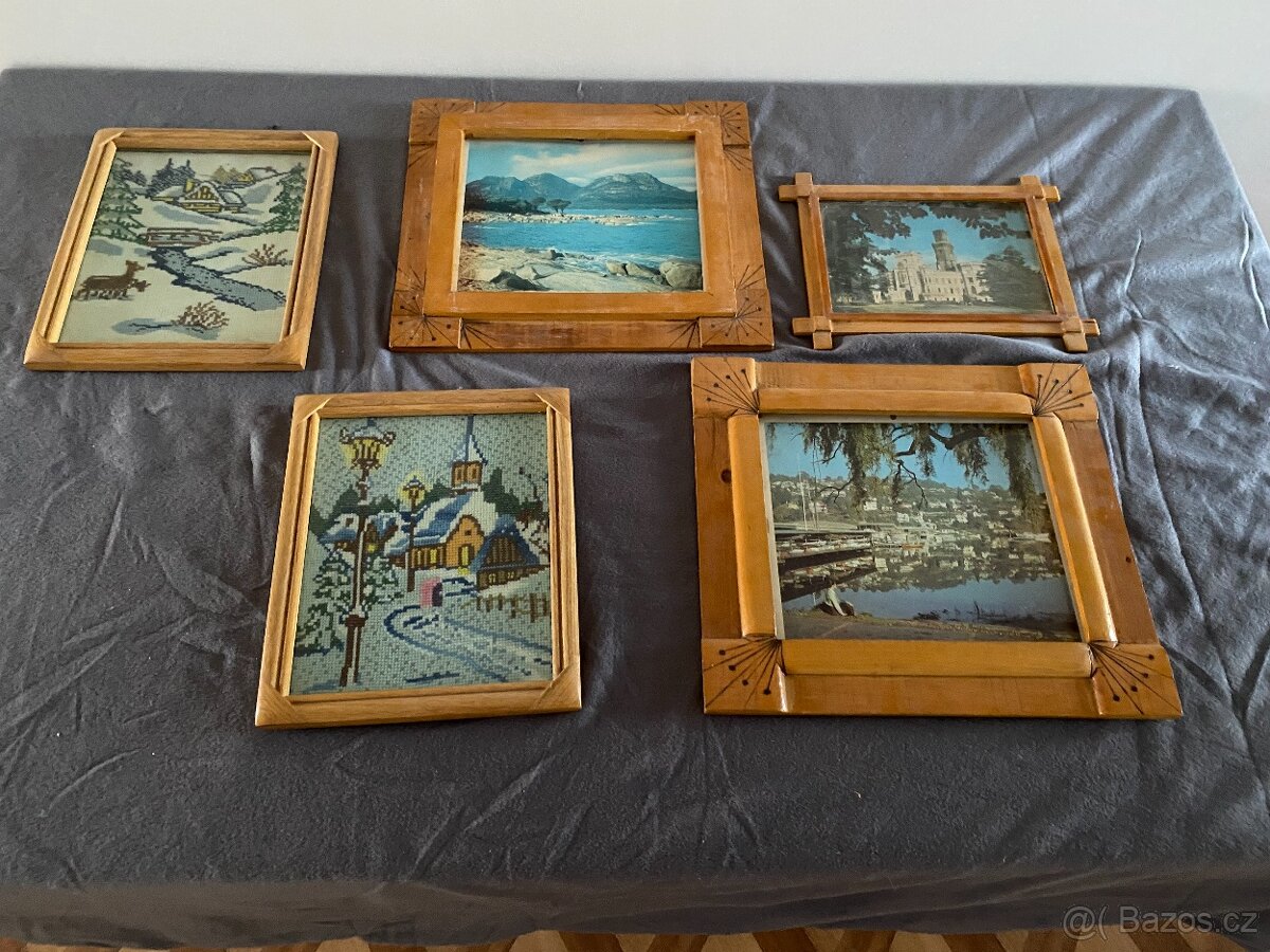 Prodám sadu 5 dekorativních obrázků v dřevěných rámech. Kombinace křížkové výšivky a tištěných fotografií. Rámy jsou v rustikálním stylu.
