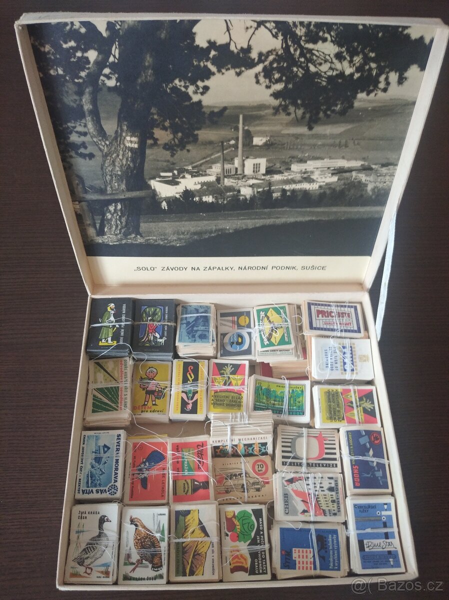 Prodám nepoužité zápalkové nálepky, cca 6.000 ks českých a cca 1.200 ks cizojazyčných, v originální dárkové krabici n.p. SOLO Sušice okolo roku 1950. Pouze jako komplet za 1.000 Kč, možná nezávazná prohlídka obsahu balíčků (balíčky obsahují různé nálepky stejné tématické řady). Nespěchám. Pouze osobní převzetí v Praze 5 – Košířích proti platbě v hotovosti.