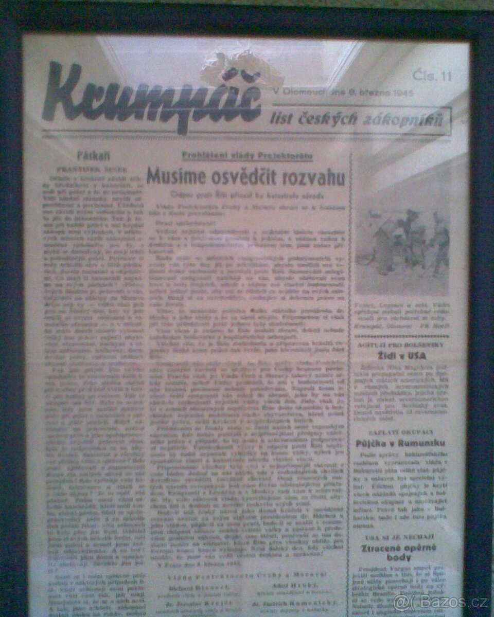 Prodám noviny Krumpáč z období tzv.Protektorátu pro české zákopníky,nasazené na obranných pracích pro Říši.Vydání je z 8.března 1945,na titulní straně je prohlášení protektorátní vlády.Stav velmi dobrý-zarámováno.