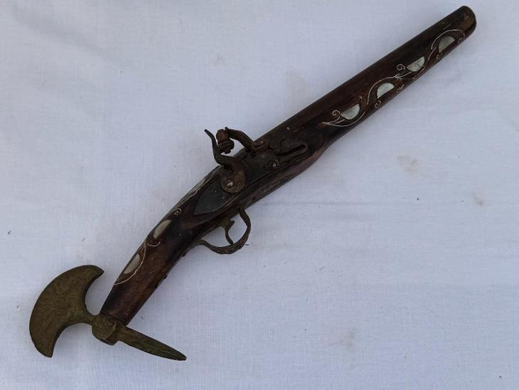 Nabízím pěknou zdobenou křesadlovku se sekyrkou .Natahováni je funkční kohoutek po natažení cvakne.Staří nedokážu odhadnout prodávám jako dekoraci.