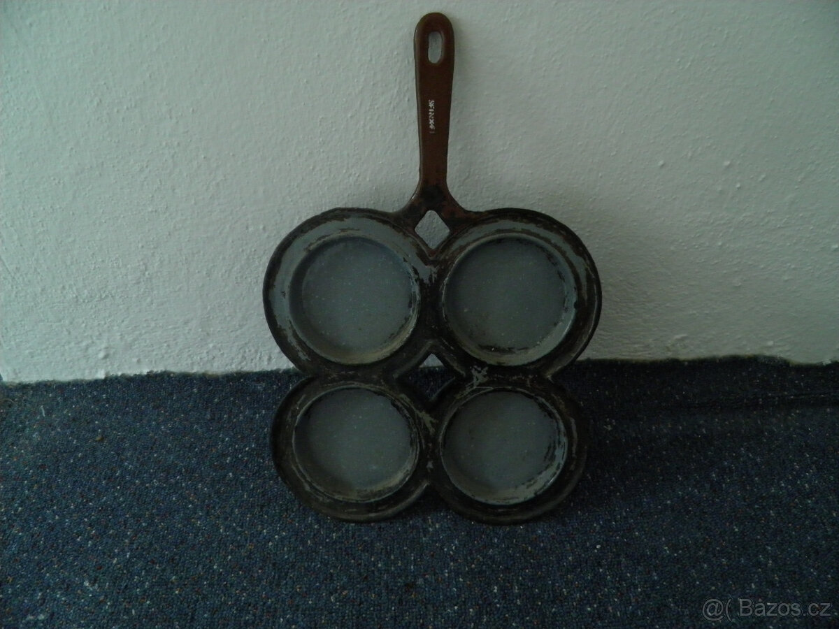 Starý lívanečník - [19.4. 2026]Nabízím starý lívanečník z modrého smaltu na 6 lívanců/volských ok. Šířka 26 cm, délka i s rukovětí 39 cm. Osobní předání v Praze.