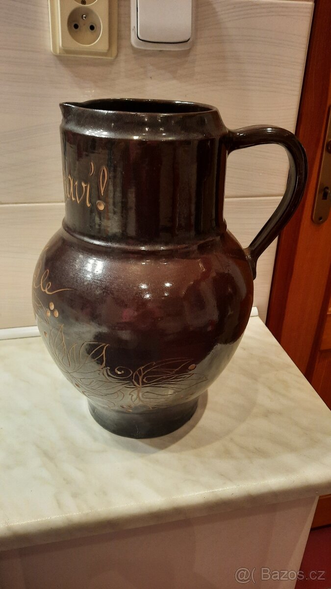 Prodám velký kameninový džbán s nápisem Na zdraví. Výška 35 cm, objem 8 l. Pozůstalost.