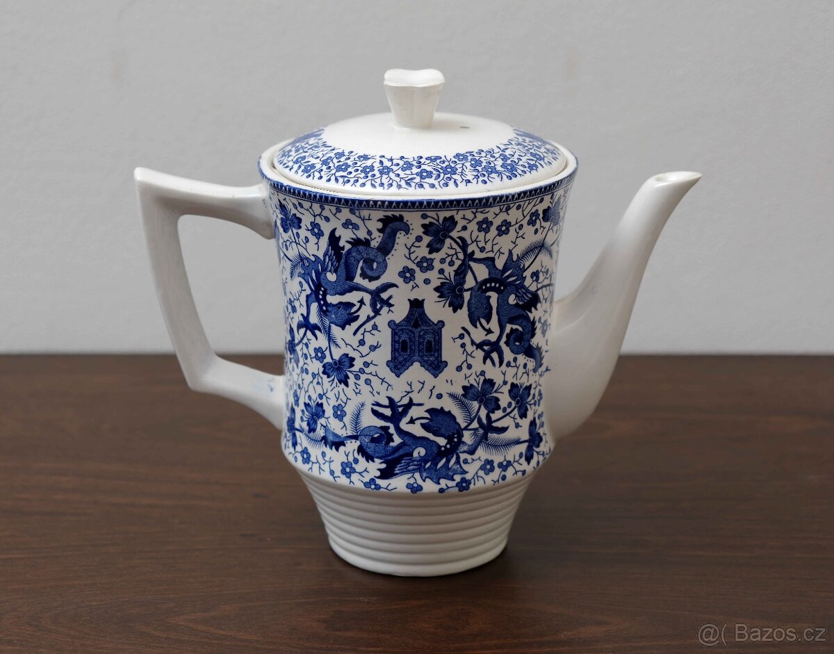 Elegantní porcelánová konvice na čaj nebo kávu z produkce belgické manufaktury Boch Frères La Louvière, zdobená výrazným modrobílým dekorem „Dragon“. Tento dekor patří mezi charakteristické motivy inspirované asijským uměním, kde se objevují stylizovaní draci, květinové úponky a drobná architektura v duchu orientální estetiky.