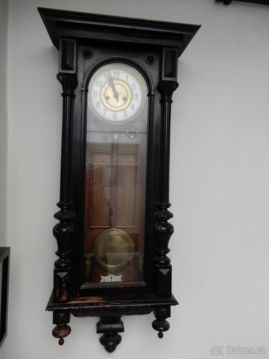 luxusní starožitné dvouzávažové nástěnné hodiny typu vídeňský regulátor.