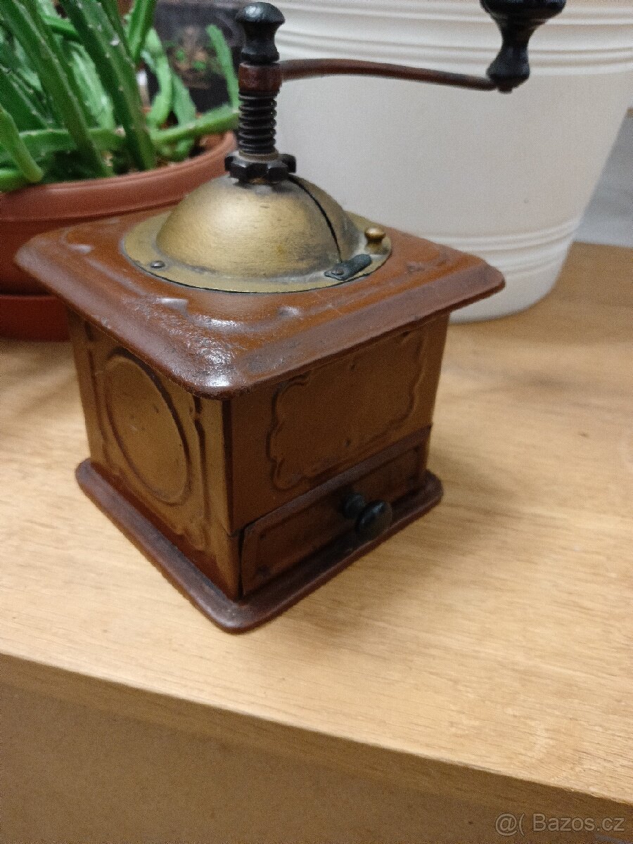 Starý mlýnek na kávu č.1 - [26.4. 2026]Prodám tento starý mlýnek na kávu. Rozměr základny je 14cm x 14cm a celková výška 22,5cm. Cena 500Kč + poštovné. Koukněte i na moje ostatní inzeráty, více předmětů= jedno poštovné.