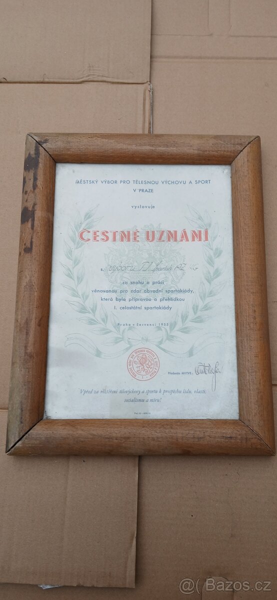 Prodám čestné uznání spatakiada 1955