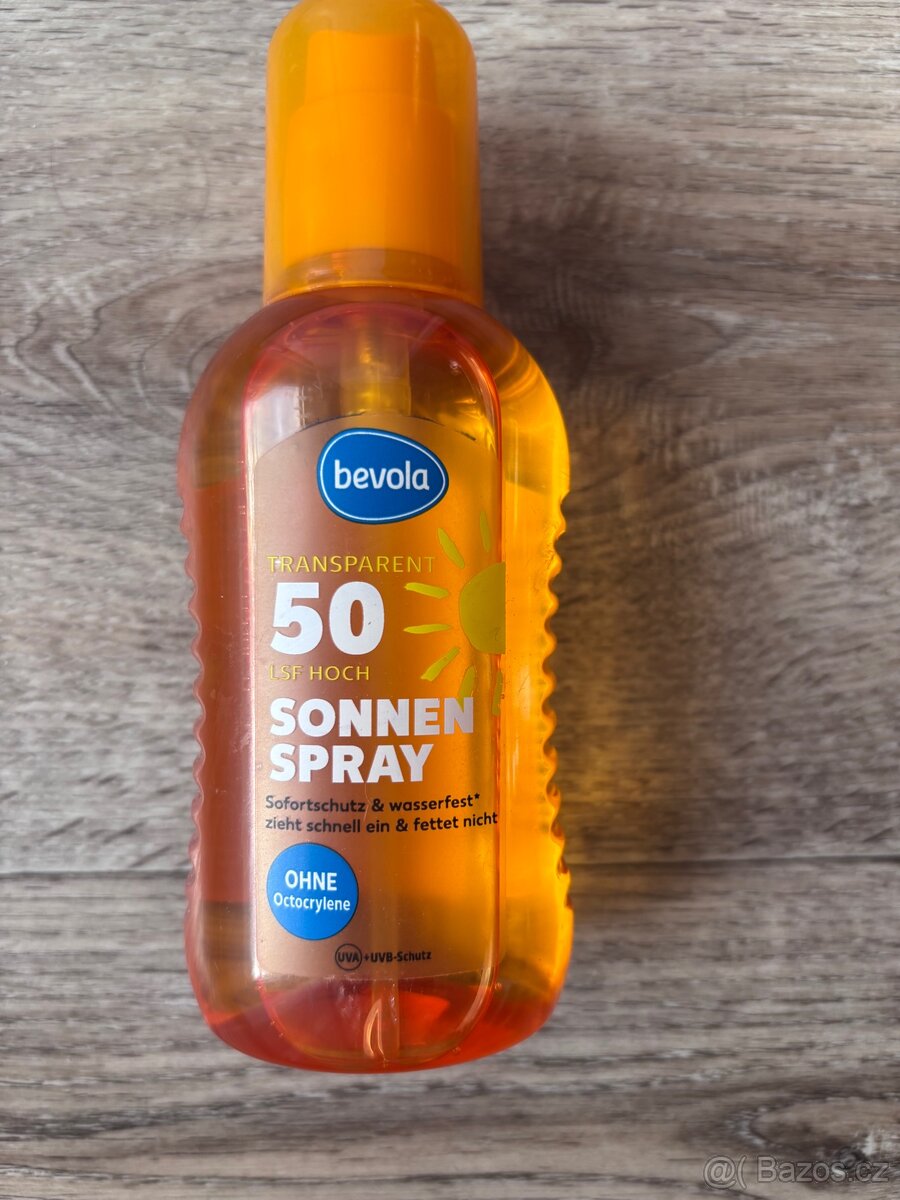 Průhledný opalovací sprej Bevola Transparent 50 LSF Hoch Sonnenspray. Opalovací faktor (LSF) 50 zajišťuje vysokou úroveň ochrany. Zajišťuje okamžitou ochranu před UVA a UVB paprsky. Voděodolná formule se rychle vstřebává a nezanechává mastný lesk. Neobsahuje oktokrylen.