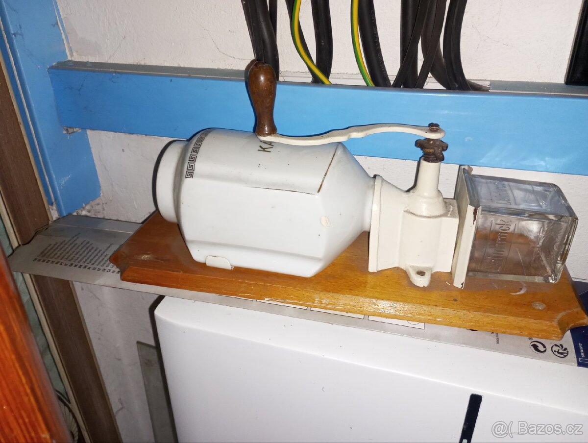 Ruční mlýnek na zrnkovou kávu (celozrné koření) s možným nastavením hrubosti mletí.