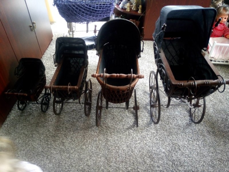 Prodám retro kočárky komplet sadu za 10000,- kč. jinak velký za 4000,-kč, druhý velký za 3000,-kč, středný za 2000,-kč, malý za 1500,-kč