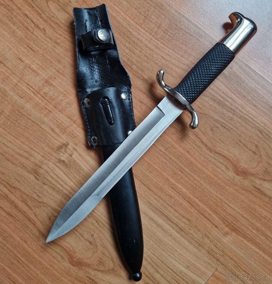 Prodám sběratelům válečných militárií a obvzlášť chladných zbraní,tuto moc pěkně udělanou a málo vídanou repliku WH německého hasičského vycházkového bodáku.Moc pěkně udělaná replika i s pouzdrem a závěsníkem.Jako nová. Celková délka: cca 33 cm.Ceny těchto originálních kousků jdou dnes do závratných výšek,tudíž toto je dobrá volba,doplnit sbírku ,nebo vitrýnu pěkně udělanou replikou za rozumný peníz.
