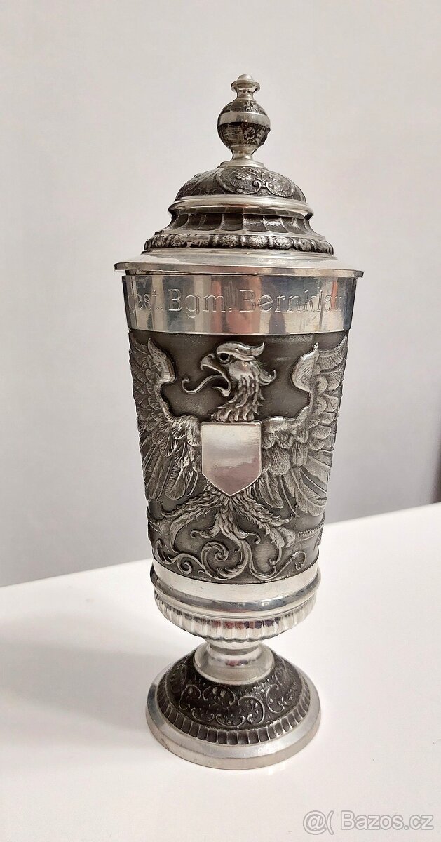 Prodám zdobenou kovovou číši s víkem, pravděpodobně z cínu (Zinn). Číše je bohatě zdobená reliéfem orlice a ornamenty.