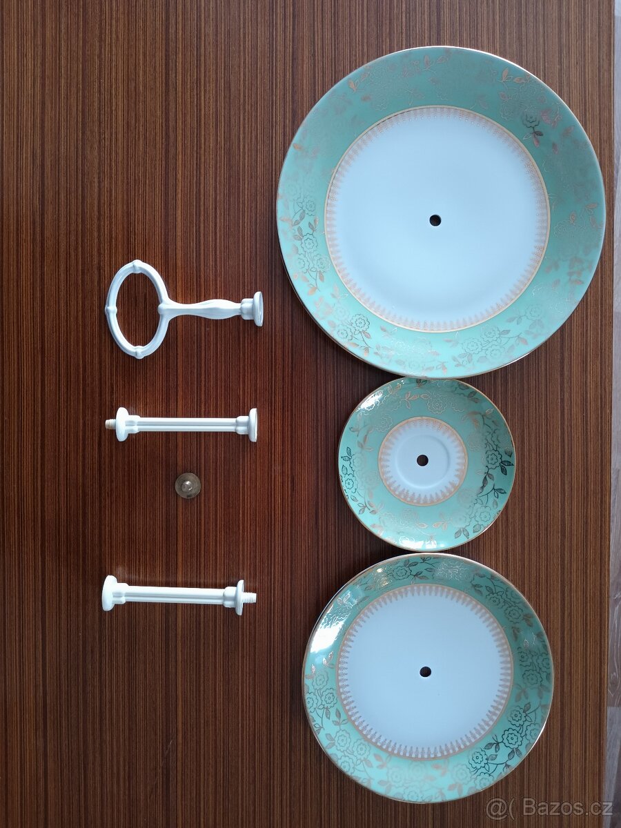 Na prodej talířový etažér, vrchní talíř odštíplý, jinak krásný stav po babičce. Souprava je kompletní.
