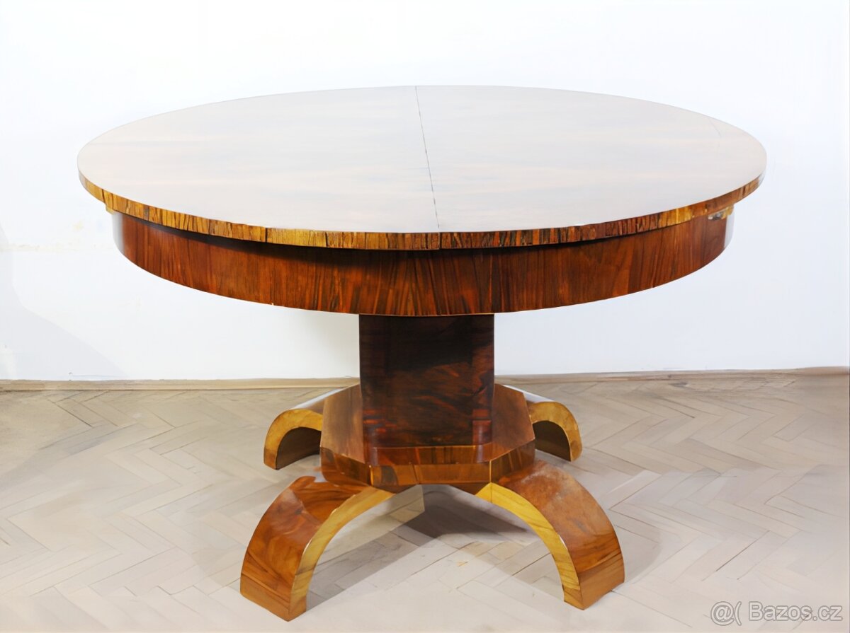 ponúkam na predaj unikátny luxusný art deco jedálenský stôl.dýha je orechová korenica a má novú šelakovovú politúru,na vrchnej doske je jedna ryha,ktorá bola pri renovácii zachovaná vrámci patiny,rovnako ako niekoľko menších poškodení dýhy na stole,vhodné vyladiť.výška stolu je 77 cm a priemer 120 cm.stôl je rozkladací,ale stredová doska nie je k dispozícii.osobné prevzatie v okrese Topoľčany.na prípadné dotazy rád zodpoviem.prosím píšte na e-mail.ďakujem
