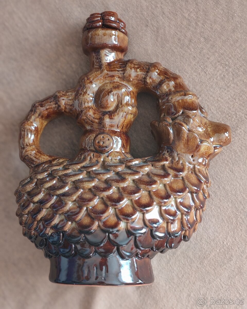 • Forma ve tvaru ryby: Tmavě hnědá glazovaná keramika, velmi žádaný dekorativní kousek na chalupy.