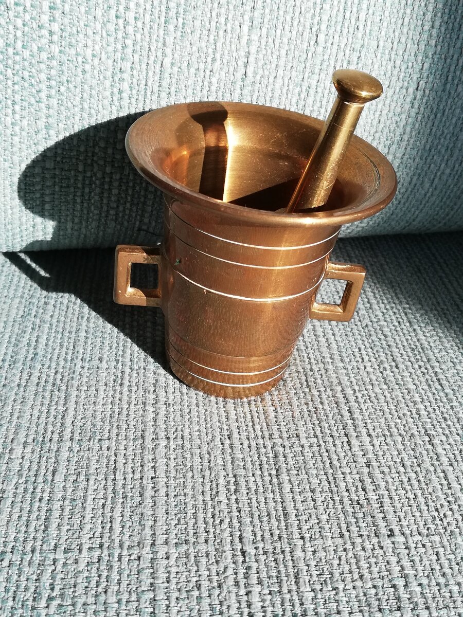 Prodám kovový hmoždíř. Výška 7 cm, průměr ve spodní části 4 cm, v horní části 9 cm.