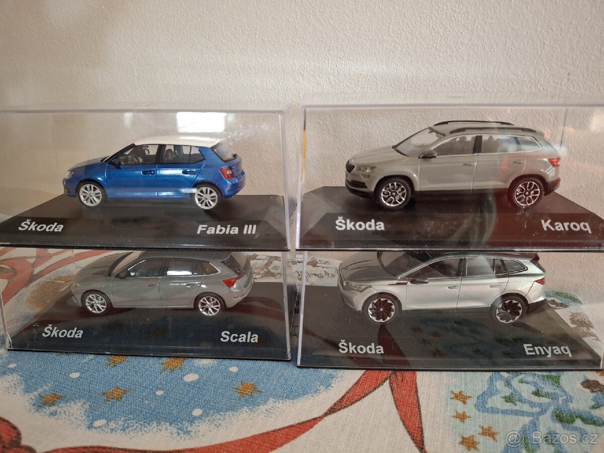 Prodám 4x model autíček 1:43 I-scale Škoda Fabia, Scala, Karoq a Enyaq. Jako nové, nehrané jen vystavené.