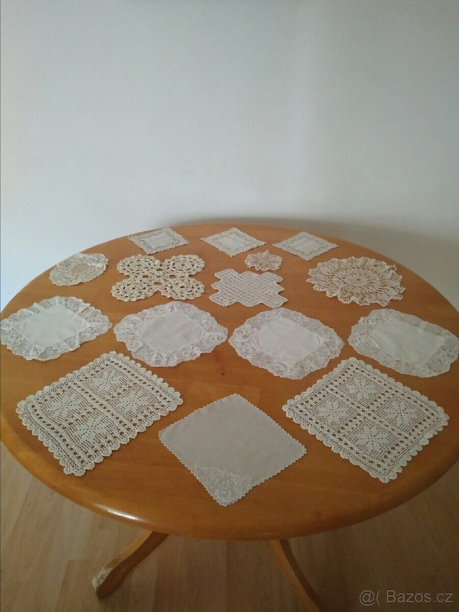 Háčkované dečky různé tvary. 18 kusů. Cena za malé kus 20,- Kč, větší 50,- Kč a límeček 40,- Kč.