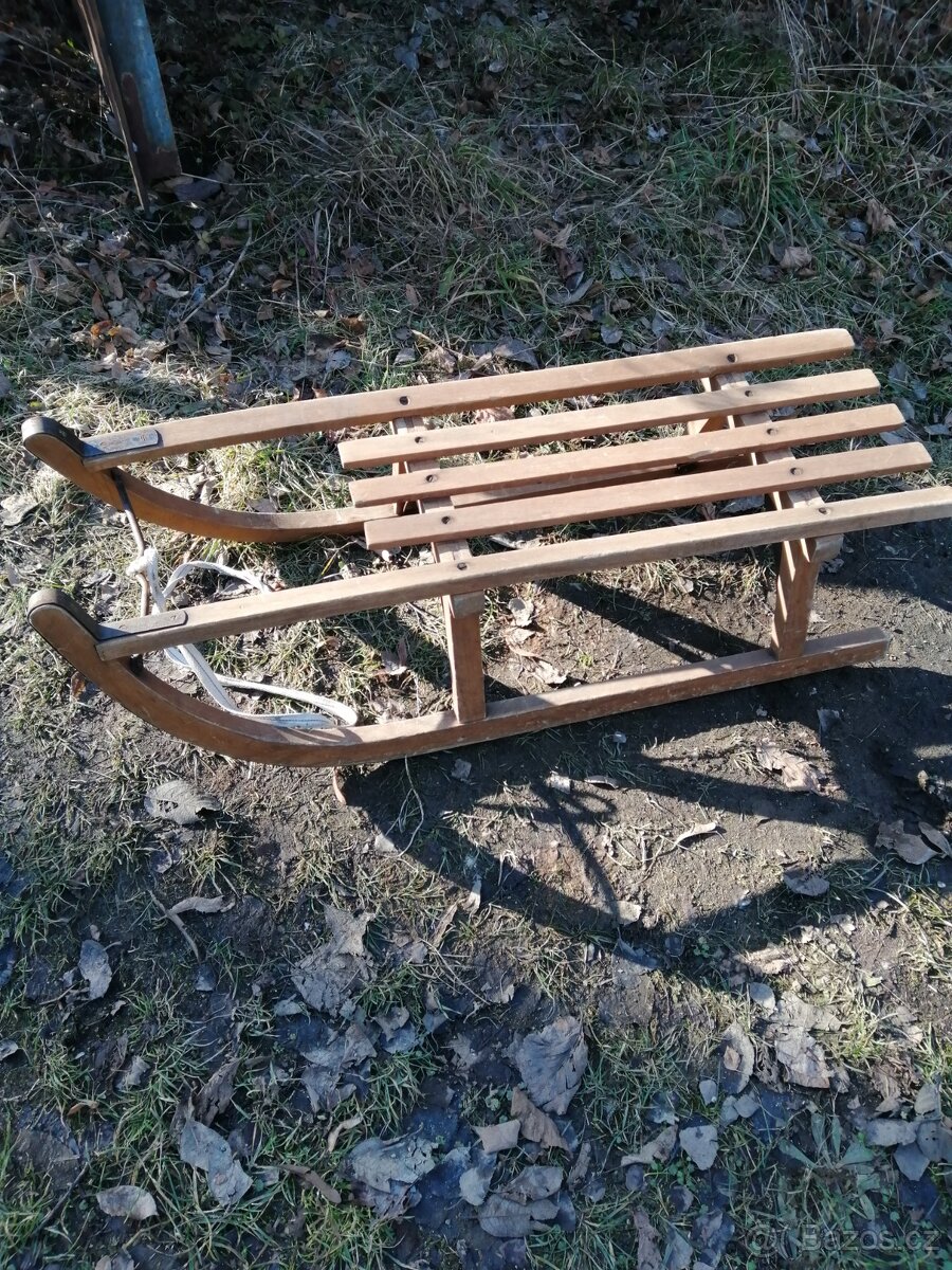Staré sáně s volantem - [23.4. 2026]Prodám staré sáně s volantem. Volant je nalomený. Stav viz fotky. Délka: 153cm, šířka: 47cm, výška volantu: cca 46cm, výška sedáku: cca 27,5cm. Jen osobní předání.