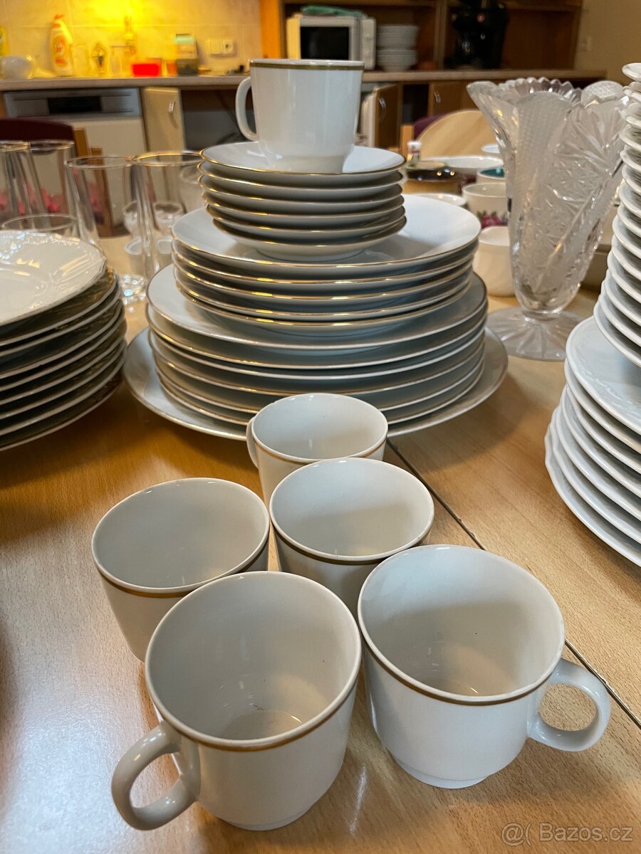Prodám porcelánovou sadu české výroby viz foto. Ještě k ní sedí mísa na polévku viz jiný inzerát (uvádím ji na obrázcích, ale není v ceně). Je značky Bohemia. Sada je téměř celá, chybí 1 hluboký talíř. V sadě je 5 ks hlubokých talířů, po 6ti kusech jsou mělké talíře, podšálky a šálky. Je možné k ní dokoupit za 100Kč dezertní talíře se zlatým okrajem, které jsou ale zdobené - nemají hladký povrch viz přidané foto.