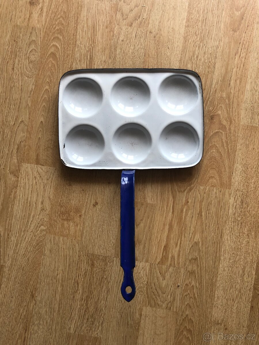 Nabízím starý lívanečník z modrého smaltu na 6 lívanců/volských ok. Šířka 26 cm, délka i s rukovětí 39 cm. Osobní předání v Praze.