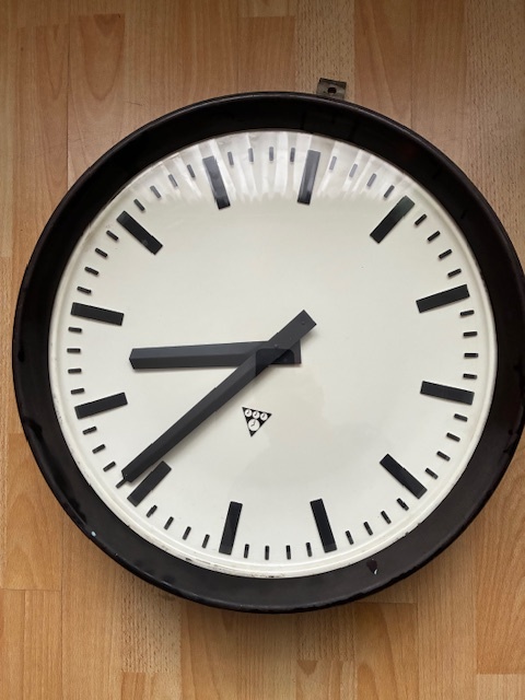 Hodiny Pragotron - [18.4. 2026]industriální hodiny bez skla, viz foto- plech je tenký, dá se vyrovnat a doladit. Cena 400Kč
