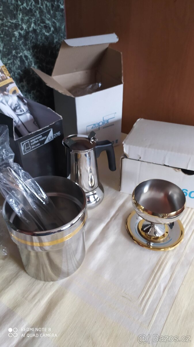 Zepter súprava so zlatým dekórom, poháre na rôzne nápoje s podšálkami, nádoba na ľad so štipcom, kávovar pre labužníkov, nepoužívané, v pôvodných krabiciach.