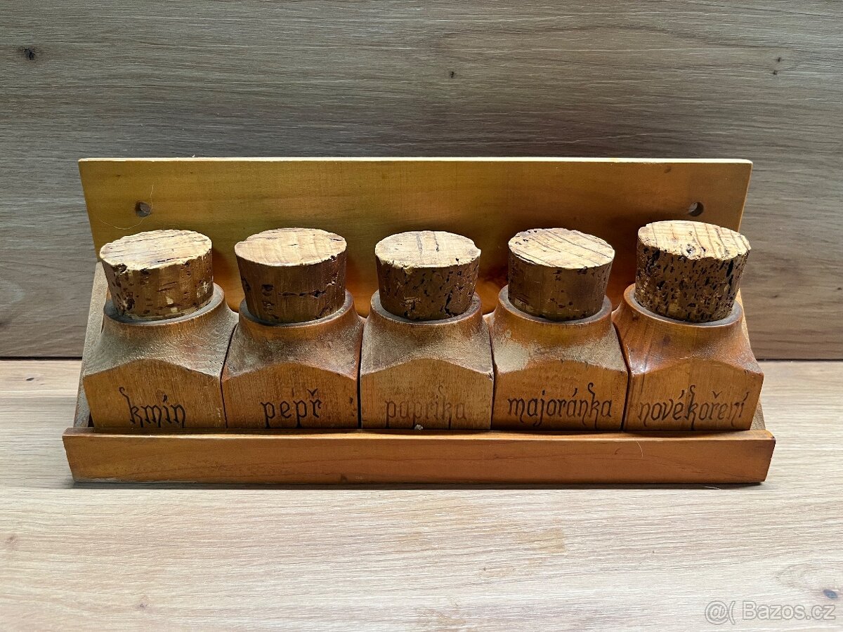 Dřevěná polička s kořenkami - [26.2. 2026]Prodám retro poličku s kořenkami, rozměry poličky: délka 46,5cm, výška 23cm.Kořenky výška 6 cm.