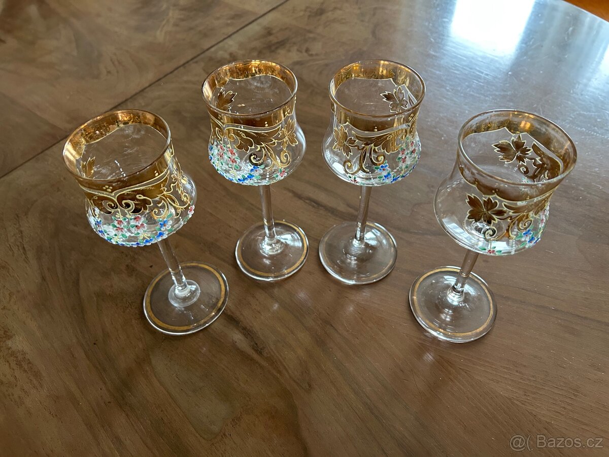 Starožitné skleničky a karafa Nová cena 390,- Kč - [24.4. 2026]4 zlacené starožitné skleničky na víno, 4 zlacené skleničky na likér a karafa. Jedna sklenička má poškozený okraj. Viz foto.