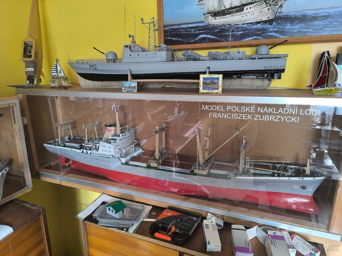 Model polské nákladní lodě Franciszek Zubrzycki 1:100 délka 161 cm, šířka 20 cm. Laminátový trup, servo kormidla, motor . Nástavba z laminátové desky, detaily z epoxidu.