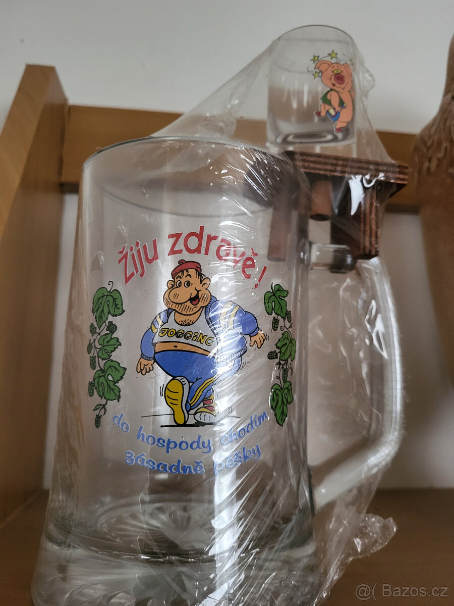 Prodám skleněný půllitr + malé štamprle, nové. Lze zaslat přes zásilkovnu. Přeloučsko.