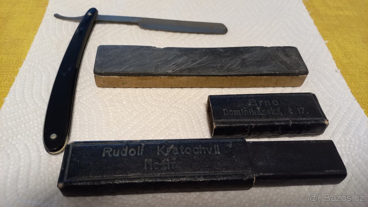 Prodávám starožitnou břitvu včetně původního pouzdra a brousku. Břitva byla vyrobená nožířem Rudolfem Kratochvílem v Brně na počátku 20. století. Neméně zajímavý je i brusný kámen o rozměrech 140 x 26 x 14 mm. Jedná se o Belgickou břidlici (lepený Belgian Blue coticule+žlutá jemná). Horní zbroušená strana je hrubá cca 4000grit, a horní žlutá je extra jemná dokončovací finish od 8000 do 12000 grit. Stav viz přiložené foto. Předání možné v Brně, případně dle domluvy. Cena je za celou sadu.
