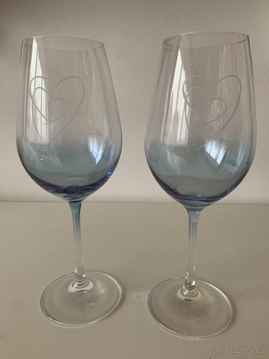 Nabízím set dvou sklenic na víno s lehkým nádechem světle modré barvy. Sklenice mají krásný broušený motiv dvou vzájemně propojených srdcí.