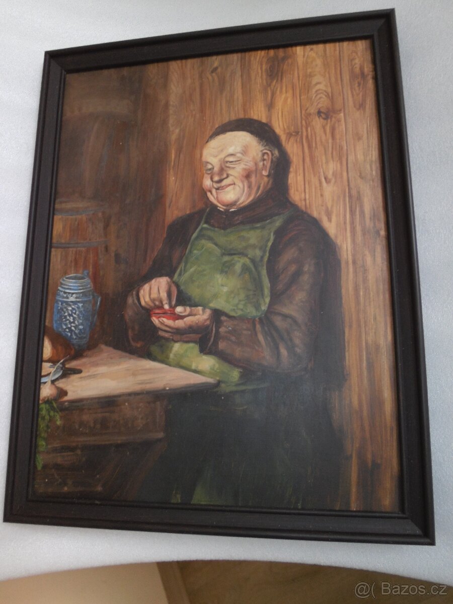 Nabízím obraz mnicha přepočítávající penízky. Malba na kartonu-desce. V levém spodním rohu možná nečitelné signování? Jinak obrázek docela dekorativní, možná do vinárny, vinného sklepa, pivnice, nebo úplně do jiného prostředí, kam si jej kupující pověsí. Rozměry obrazu celkové 32,5 x 42,5 cm. Cena 1400 kč. V případě poslání + 160 kč.
