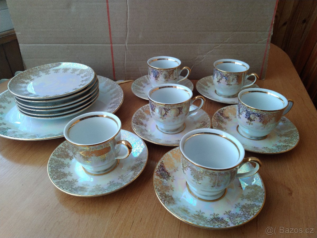 Perletova sada . Nepoužité.6kusu desertovy talířek,1 kus velký talíř,6kusu šálek s podsalkem.Jindrichuv Hradec